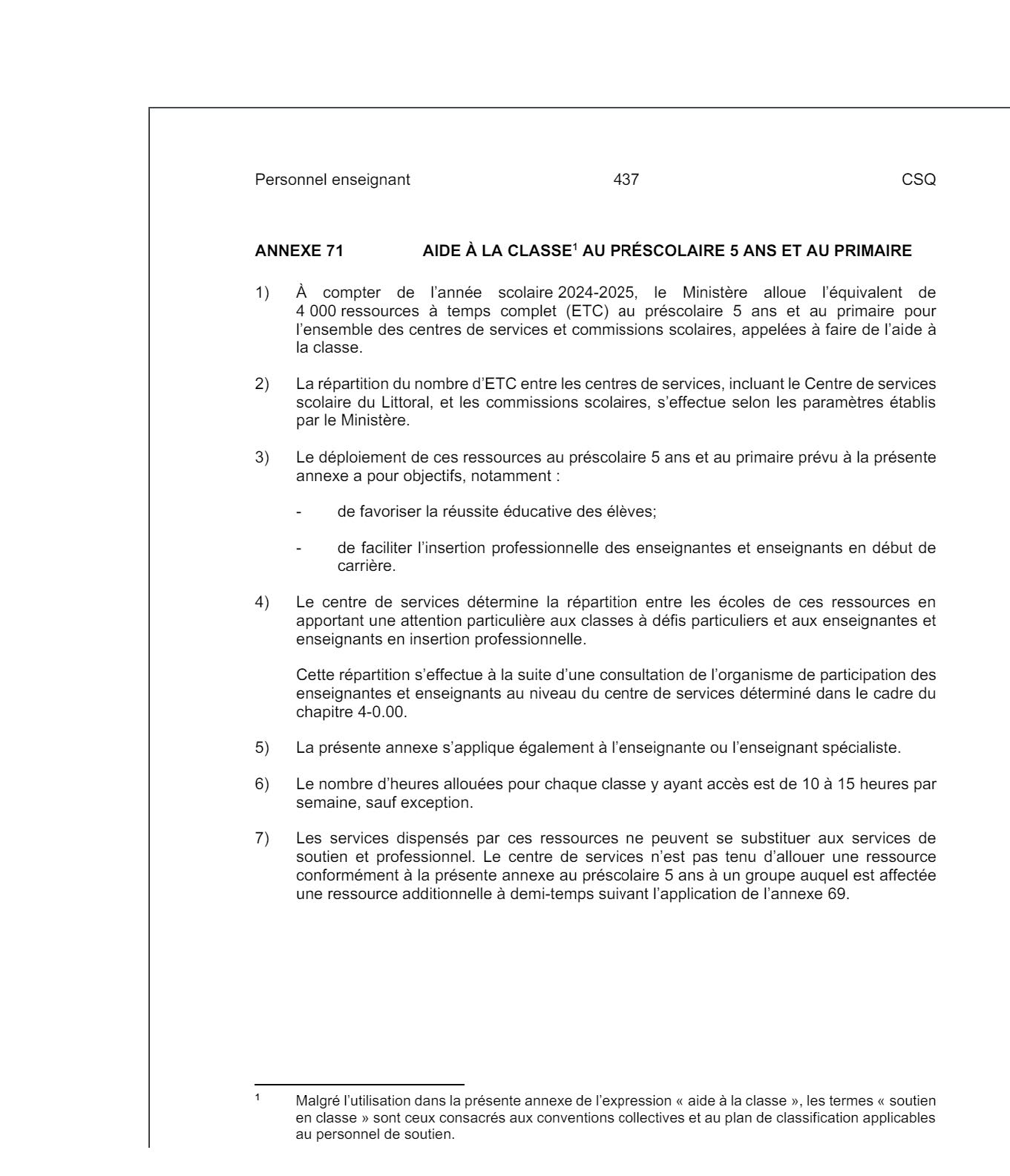- À l’annexe 71 de la convention collective du personnel enseignant : « Le nombre d’heures allouées pour chaque classe y ayant accès est de 10 à 15 heures par semaine, sauf exception ».