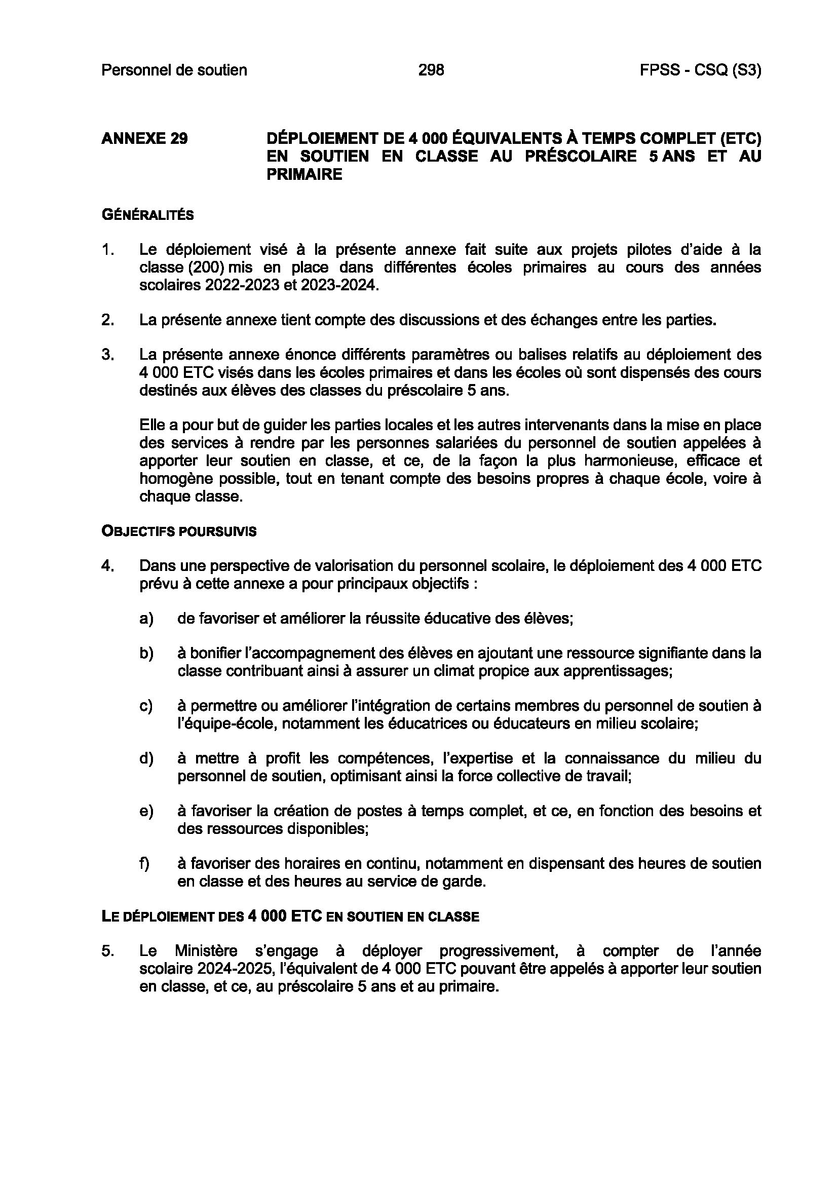 - À l’annexe 29 de la convention collective du personnel de soutien : « Dans l’exercice de cette responsabilité, la direction de l’école favorise d’une part la création de postes comportant le plus grand nombre d’heures possible, et d’autre part des horaires en continu, et ce, en fonction des besoins et des ressources disponibles ».